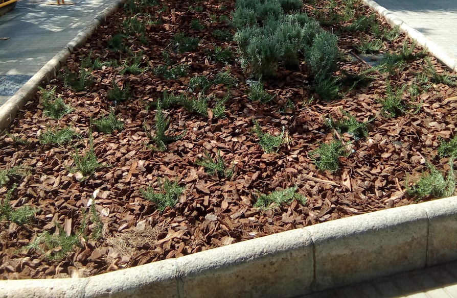 En esta zona pública diseñamos un parterre de bajo mantenimiento bajo un árbol monumental con diversas especies vegetales aromáticas:
